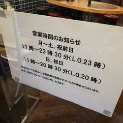 | 営業時間 | 11:00~23:00 [月] 11:00~21:30 [日・祝] 11:00~20:30 ※ラストオーダーは各30分前 |