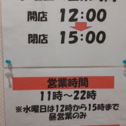 | 営業時間 | 日〜火、木〜土;11:00〜22:00 水 ;12:00〜15:00 |