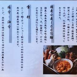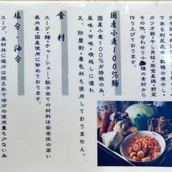 | 備考 | 食材にこだわった無化学調味料ラーメンを提供するお店。 無添加餃子は持ち帰りもできる。 |