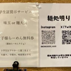 | 備考 | ☆学生証提示サービス→味玉or麺大盛 ※混雑時は、お先に食券の購入をお願い致します |
