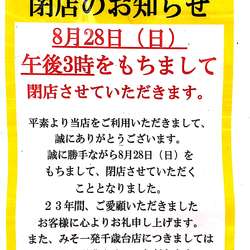 2022年8月28日(日)午後3時をもちまして閉店させて頂きます。平素より当店をご利用いただきまして、誠にありがとうございます。誠に勝手ながら8月28日(日)をもちまして、閉店させていただくこととなりました。23年感、ご愛顧いただきましたお客様に心よりお礼申し上げます。また、みそ一発千歳台店につきましては引き続き営業させていただきます。