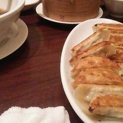 前菜、スープの後に供された標題。至ってフツーの焼餃子。おビールにぴったり。