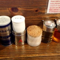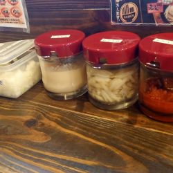 卓上調味料:おろしニンニク・刻み生姜・豆板醤・刻み玉葱・醤油・ラー油・酢・BP・すりごま・漬物