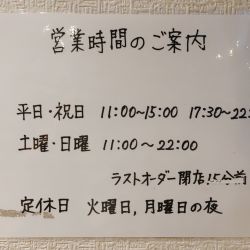 | 営業時間 | 11:00~15:00/17:30~22:00 [土・祝] 11:00~22:00 [日・連休最終日] 11:00~22:00 [月] 11:00~15:00 ※ラストオーダーは各15分前 |