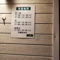| 営業時間 | 11:00~15:00/18:00~21:30 ※水曜日は夜の部休み。 [土] 11:00~15:30/18:00~21:00 [祝] 11:00~15:30 ※各ラストオーダー30分前 |